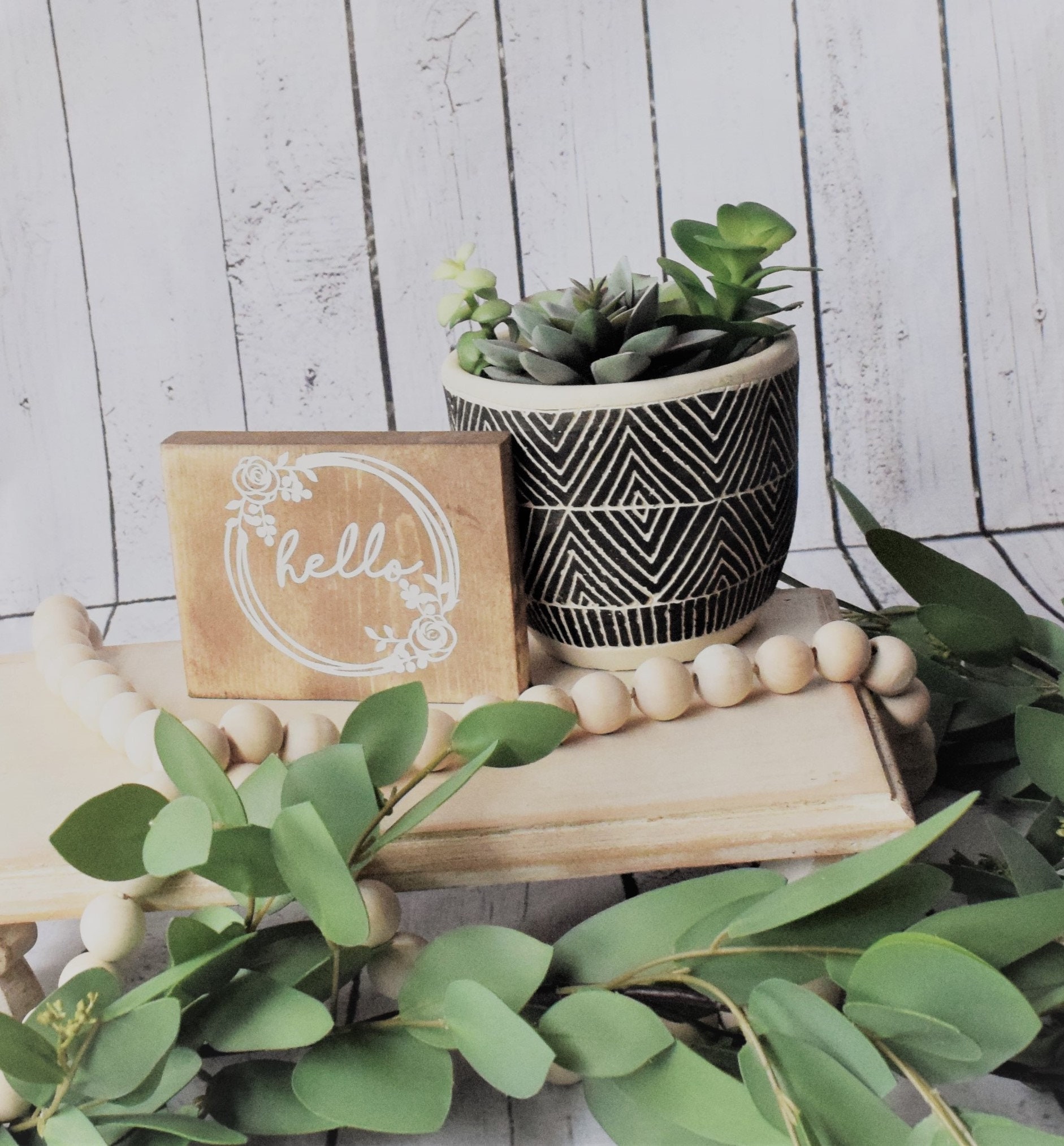 Hello Floral Wreath Country Farmhouse Rustic Wood Block Sign
