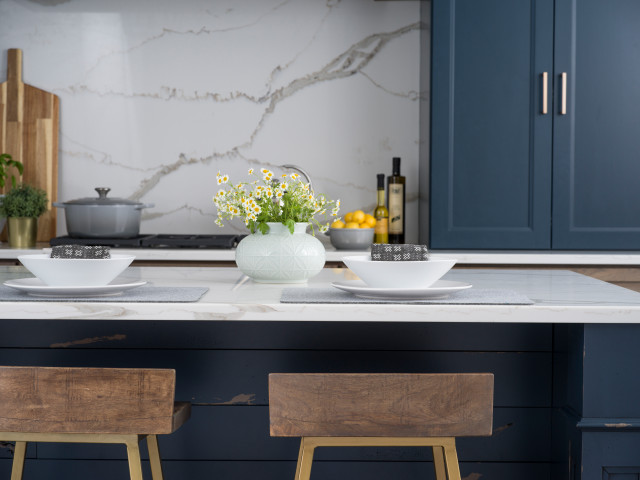 Farmhouse Kitchen With Navy Blue Cabinets And Light Countertop