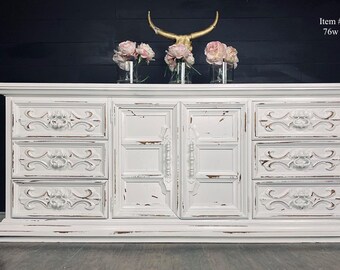 Rustic Farmhouse Solid Distressed White Wood Dresser Console