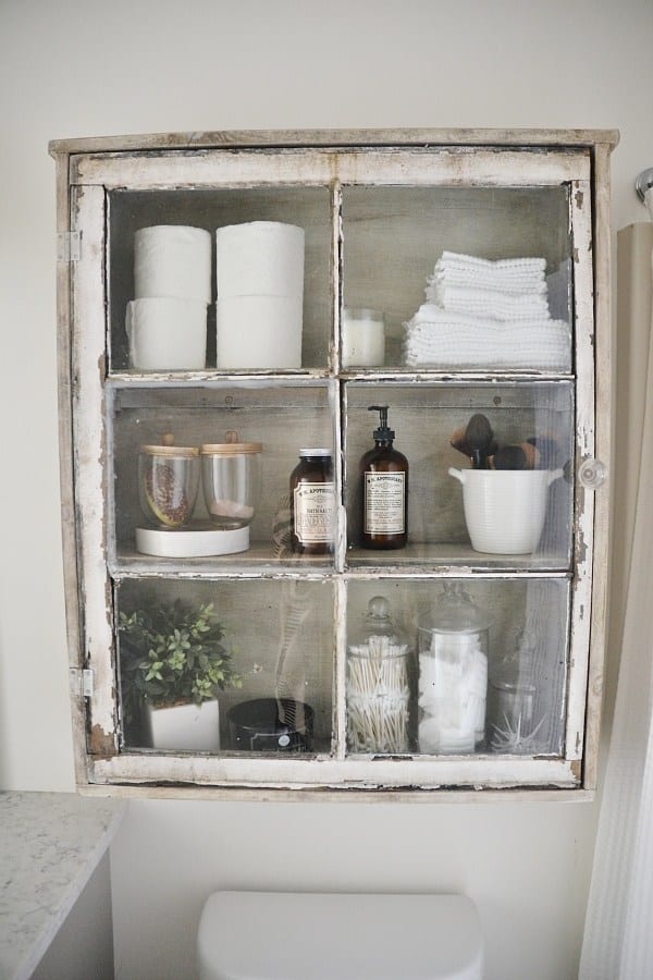 Glass And Metal Vintage Pharmacy Cabinet In Farmhouse Bathroom