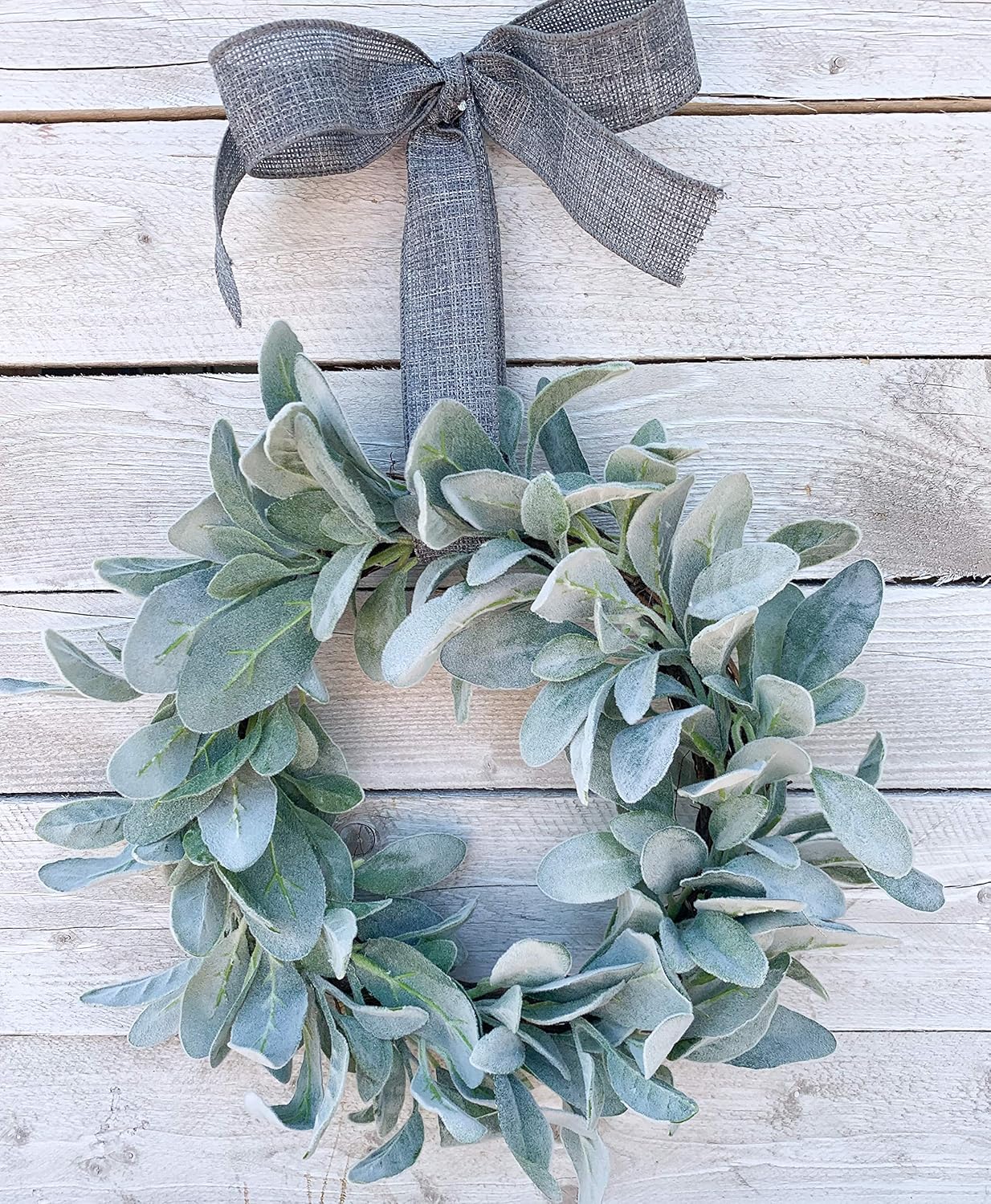 Amazon Com Lambs Ear Wreath 14 Inch Farmhouse Front Door Decor Blue Or Tan Ribbon With Bow Grapevine Base Kitchen Pantry Decor Handmade