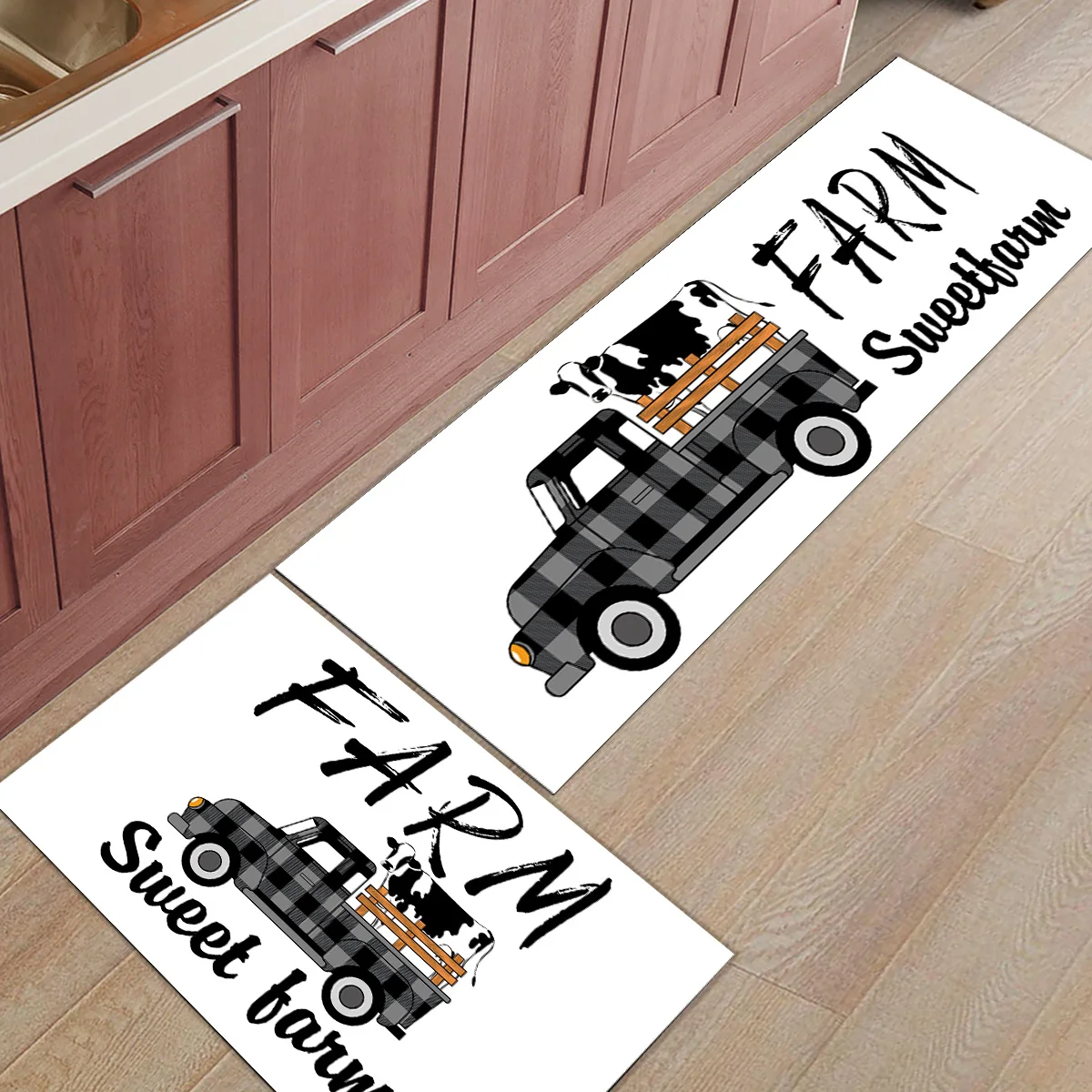 2pcs Set Farmhouse Cow Black White Check Truck Anti Slip Doormat