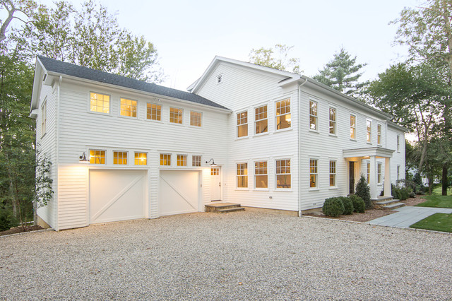 Modern Farmhouse With White Clapboard Siding Black Garage Doors