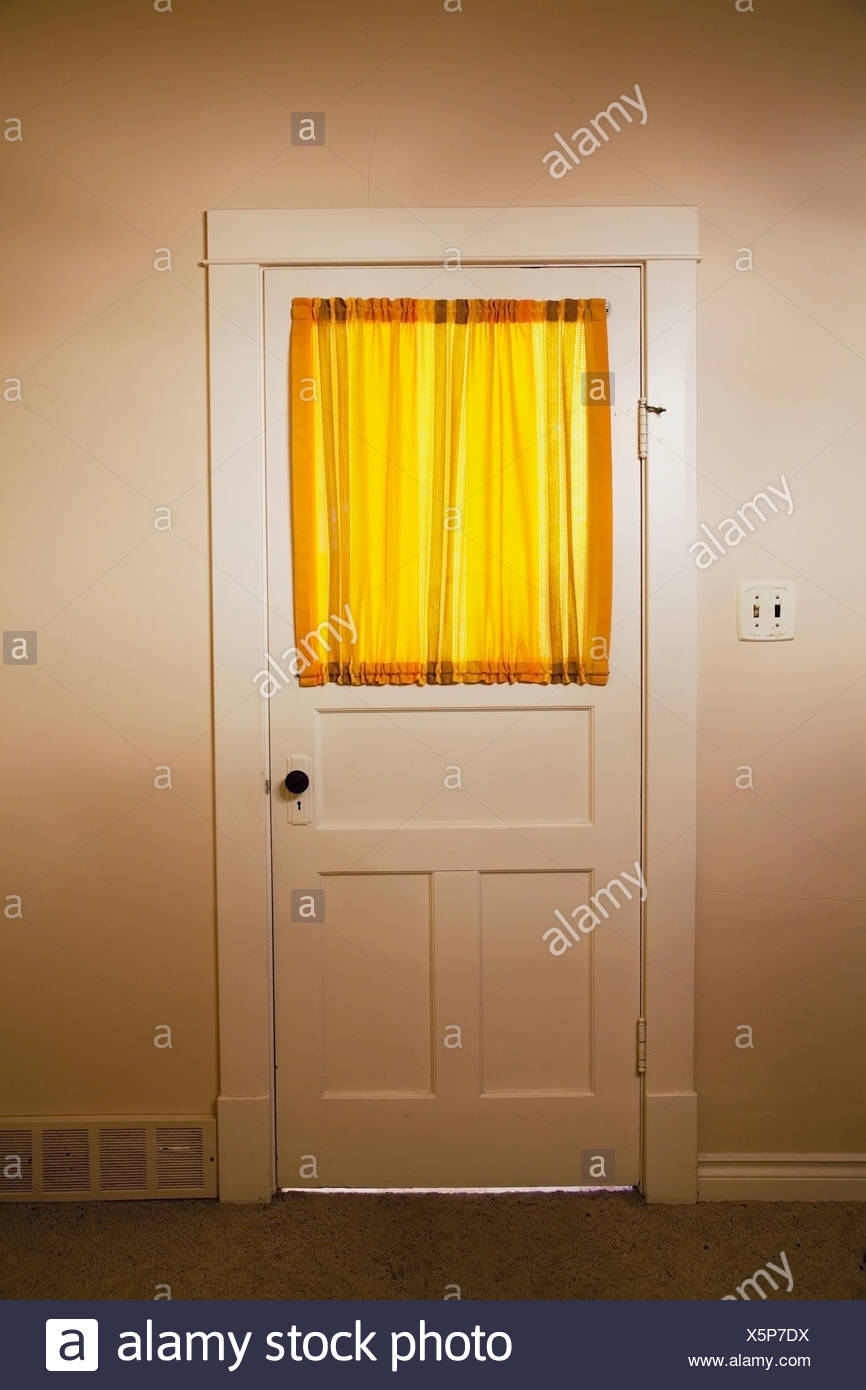 Interior Door Of A 1920 S Farmhouse With Yellow Curtains On The