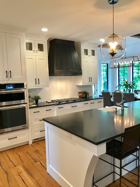 Clean White Farmhouse Kitchen With A Reclaimed Wood Range Hood And