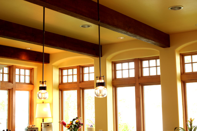 Exposed Wood Beams On Kitchen Ceiling With Yellow Walls And