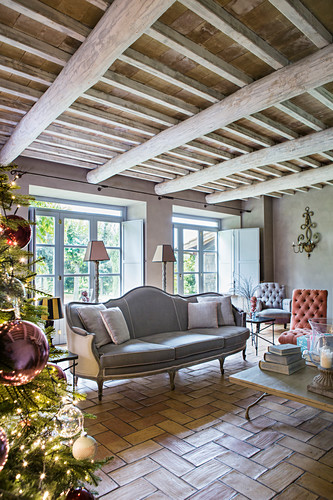 Christmas Tree And Grey Sofa In Living Buy Image 12977465