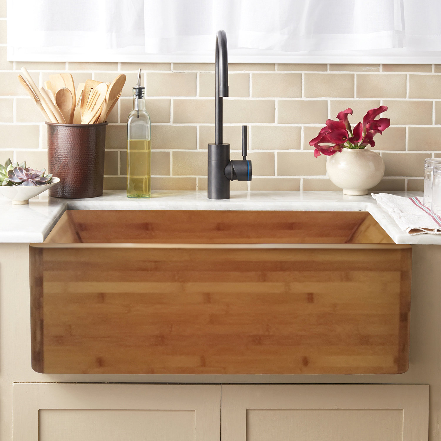 Natural Wood Loft Kitchen With Copper Farmhouse Sink Textured