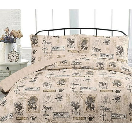 Country Farmhouse Barn Rustic Roosters Taupe Tan Full Queen