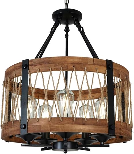 Deralan Modern Rustic Chandelier Round Wood Five Lights Farmhouse