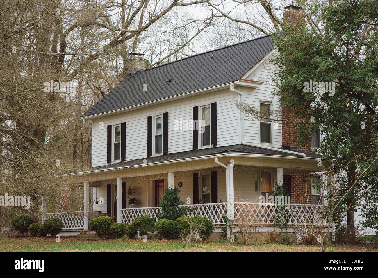 Traditional 2 Story White Blue Shutters Farmhouse